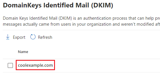 Under DomainKeys Identified Mail (DKIM), select your domain name. (Make sure to select the domain name itself, and not the checkbox next to it.) A window will open on the rightmost side.